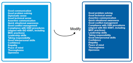 The collected elements of distinctive competencies (Good communication, Good problem solving, Diplomatic sense, Good technical sense, Assertive communication, Quick situational awareness, Good conflict management, Compliance with OSH procedures (aligned with ISO 45001, including MOC practices), Leadership skills, Taking responsibility, Good interpersonal skills, Confidence, Empathy, Peace of mind, Thoroughness, and Openness) represent the education-related tasks of employees, and through them, of representative organizations such as trade unions. In this case, it is also possible to merge components that show a strong similarity to each other. The changes are presented in Figure 8.