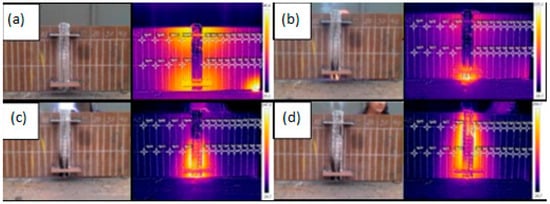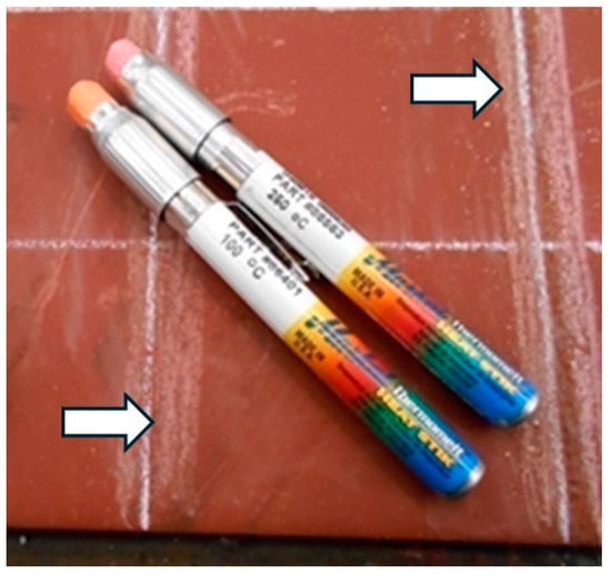 In addition to the use of thermography, thermal waxes were used (see Figure 3) as a backup method to measure the heat dispersion in the test specimens, in such a way that they were placed parallel to the vertical stripes, indicating distance. According to the manufacturer’s specifications, the measuring accuracy of these waxes on the centigrade scale is +/− 3%. Since the waxes melt upon reaching a set temperature, they allow for a quick visual analysis.