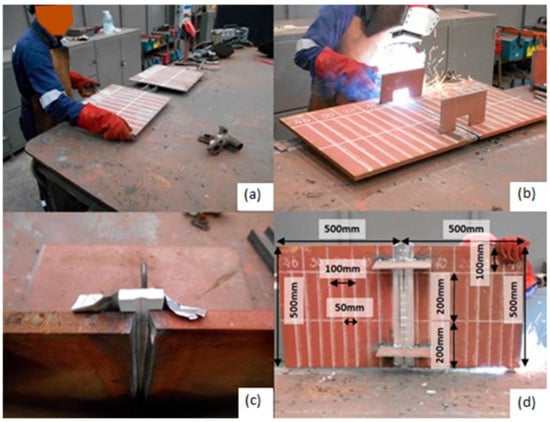 Figure 4. (a) The two elements of the sample, each 500 × 500 mm; (b) placement of bridges, which allow us to weld the sample; (c) gap between the elements due to the bevel and backing ceramics for welding; (d) sample ready for welding, and the grid dimensions.