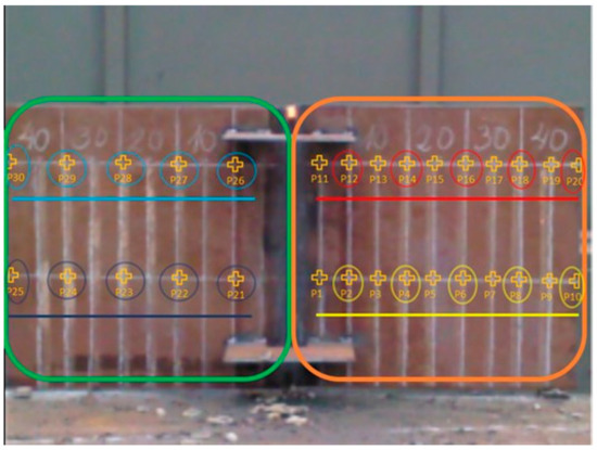 To verify that the behavior of the material is isotropic and, therefore, it is possible to study only one of the plates, the mean temperatures (together with their standard deviations) are compared in Figure 5 by selecting points from both the green and orange zones. The same points were on both plates within the main divisions (marked with circles in the image; 100 mm, 200 mm, etc.; comparing points along the light blue line with those along the red and points along the navy blue line with those along the yellow ones), thus obtaining (with the thermographic data) a mirror image of the behavior of heat in both plates.
