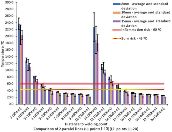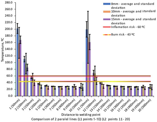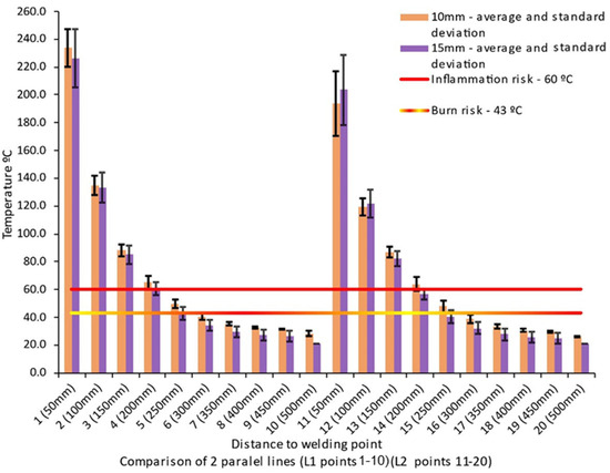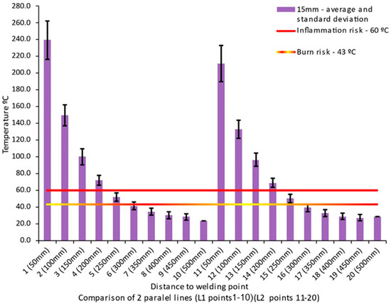 Figure 9. Comparison of 2 parallel lines, L1 (points 1–10) and L2 (points 11–20), for the 10 and 15 mm thicknesses during the third welding pass (the 8 mm thickness is not shown as it only needed 2 welding passes), showing the average temperature and standard deviation of each one for comparison. Burn and inflammation risk lines are shown too.