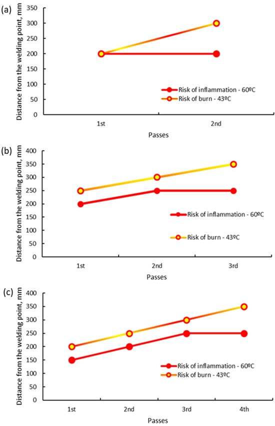 Figure 11. Safety distances for each of the thicknesses in relation to the number of welding passes: (a) for a thickness of 8 mm and 2 welding passes; (b) for a thickness of 10 mm and 3 welding passes; (c) for a thickness of 15 mm and 4 welding passes.