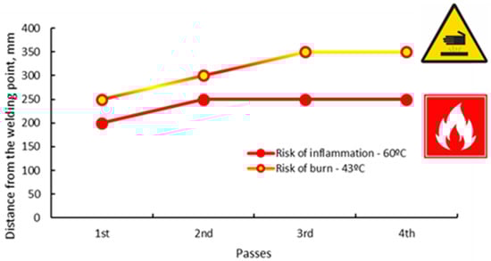Figure 12. Safe distances for each welding pass, taking the worst (highest) value of the three thicknesses as a quick reference for the minimum distance to maintain in the worst possible case.