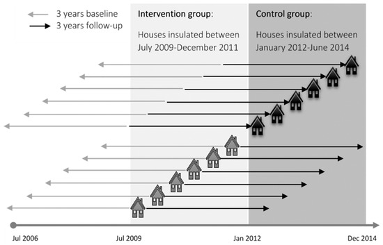 Heat Smart, which started in July 2009, was available for all privately owned properties irrespective of who the occupants were. Healthy Homes, started in August 2013, was made available for all privately owned properties where at least one resident held a community service card, which is provided to people receiving government payments such as pensions, unemployment benefit, sickness benefit and full-time students. The current study used an existing address-match between the EECA WUNZ dataset of retrofitted homes (including the timing and scope of the retrofit) and encrypted national health information (NHI) numbers for residents of the addresses studied, although addresses and names were stripped from the analysis dataset so that participants could not be identified. As illustrated in Figure 1, baseline injury data were analysed for houses over a 3-year period prior to insulation being retrofitted for the intervention group. For the control group, baseline injury data were analysed for houses also over a 3-year period, but between 6 and 3 years prior to insulation being retrofitted. Follow-up rates of hospitalisations for home falls were then compared to rates for the same period post retrofit for the intervention group, or for the 3-year period prior to insulation being retrofitted for the control group. Any changes between the rates for the two periods were then compared to changes in home fall hospitalisation rates for a matched cohort of people in homes that also received the retrofit intervention, but during the subsequent 3-year period (see Figure 1). This design ensured that the two populations being compared were as similar as possible. As fall rates were compared over identical time periods for the intervention and control groups, the design also averted analytical problems in comparing rates subject to different hospitalisation admissions policies or injury coding practices, which can change over time.