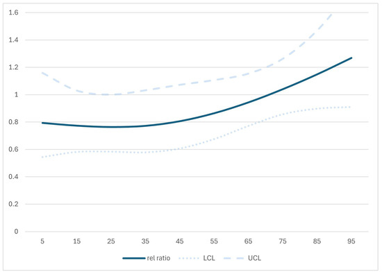 Relative rate ratios for home fall injury hospitalisation associated with the insulation programme according to age as modelled by cubic splines, with 95% CI upper and lower limits (dotted lines).