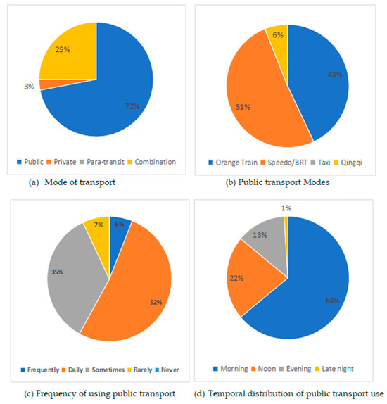 Figure 2 shows that public transport is the primary mode of commuting, with 72% relying on it, while 25% use a combination of public and private transport. Only 3% use solely private transport. This high reliance on public transportation highlights the need for enhanced security measures for women in these settings. The primary modes of public transport include the Speedo/BRT (51%) and the Orange Train (43%). Qing qi usage is lower, at 6%. This breakdown may reflect the perceived security or accessibility of these services. Moreover, regarding the frequency of using public transport, 52% of respondents use public transport daily, with 35% using it sometimes and 7% rarely. This regular usage underlines the critical role of public transportation in these women’s lives and the importance of consistent security measures. The majority travel in the morning (64%), likely related to commuting for work or study. Noon and evening travel account for 22% and 13%, respectively, while 1% travel late at night. This distribution underscores the need for security measures, particularly in the morning when most women use public transportation.