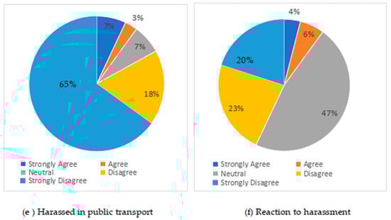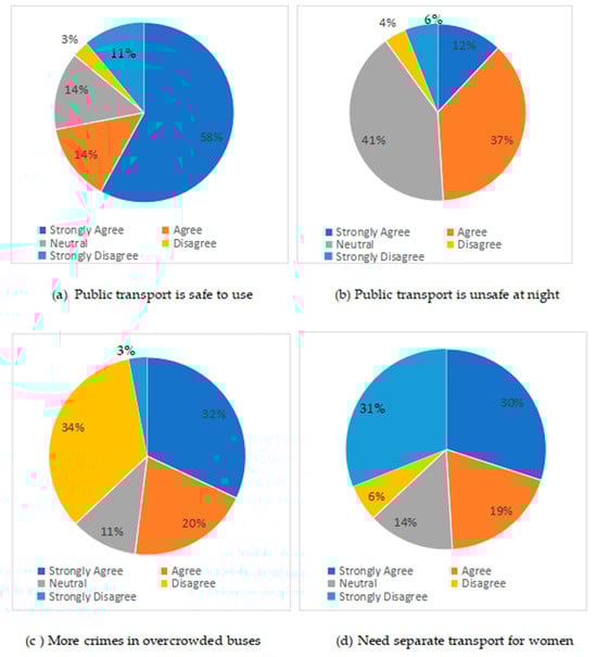 Table 1 shows that the majority of respondents are young, with 41% between 18 and 25 years and 40% in the 25–50 years age range. This suggests that public transportation is heavily utilized by younger women, likely due to their higher mobility needs related to education, employment, or other activities. A smaller percentage (11%) is under 18 years old, and only 8% are over 50 years old, indicating a lesser dependency or preference for public transport among these age groups. Education levels are skewed toward higher qualifications, with 50% of respondents having a graduate or postgraduate degree, while 26% have completed matriculation. A smaller portion, 18%, are under matric, and 6% are uneducated. The high educational attainment among respondents could imply that educated women are more inclined to use public transportation, possibly due to job or study requirements; 42% of respondents are married, and 23% are unmarried. 16% are engaged, and 19% prefer not to disclose their marital status. This distribution suggests that married women are still a significant group among public transportation users, but a notable segment chose not to disclose their marital status, which may reflect privacy concerns. Among those married, 31% have been married for 1–5 years, with 10% married for over 10 years. This reflects a diversity of experience and potentially different security concerns based on family commitments. 55% indicated “Not applicable,” which could correlate with the younger, unmarried group or those without children. Furthermore, among married or engaged respondents, 15% have two children, and 18% have more than two, which may influence the frequency and timing of their public transport usage. Employment status shows 39% as students, the largest segment, followed by 33% as housewives. 20% are in jobs or businesses, and 8% work from home. This suggests that students and homemakers are significant users of public transport, possibly due to limited access to private vehicles or flexible travel schedules. Income levels are generally low, with 58% reporting no income and 25% earning less than 30,000. Only 1% have an income greater than 70,000, indicating that most public transport users fall within lower income brackets, potentially affecting their ability to afford alternative transportation options.