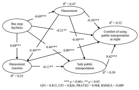 Model results confirmed all hypotheses, with statistically significant paths (p < 0.05). Figure 5 illustrates these relationships alongside the corresponding path coefficients and fit indices. The negative relationship between bus stop facilities and harassment (β = –0.69, p < 0.001) suggests that even respondents with positive views of stop facilities still report experiencing harassment—indicating that infrastructure alone cannot eliminate harassment risks. Conversely, the positive relationship between bus stop facilities and harassment reaction (β = 0.68, p < 0.001) implies that respondents who perceive bus stops as secure are better prepared to respond effectively to harassment through active measures such as confronting the harasser, lodging complaints, or employing avoidance strategies.