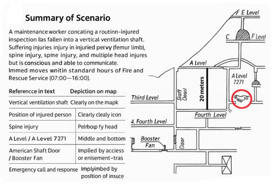 The simulated scenario involves the rescue of a maintenance employee who, during a scheduled inspection of the vertical ventilation shaft, slipped and fell to a position partway down the shaft. The injured person fell down to rest on a sloped ledge located 20 m vertically below the shaft’s top portal and 4 m laterally from the central axis, adjacent to the junction with an abandoned lateral inspection drift. The ledge is inclined at approximately 25°, covered with loose debris, and bordered on one side by the remains of a corroded ladder segment in a partially collapsed condition.