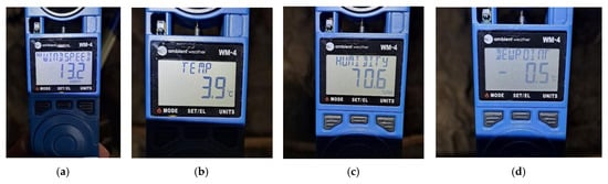 The Ambient Weather WM-4 is a comprehensive handheld wind meter, directional compass, comfort index monitor, and psychrometer, all in one compact, portable, rugged package [35]. It measures wind speed, wind direction, temperature, relative humidity, and compass direction and calculates the wind gust, dew point, wet bulb and dry bulb temperature, Delta T, wind chill, and comfort index [36].