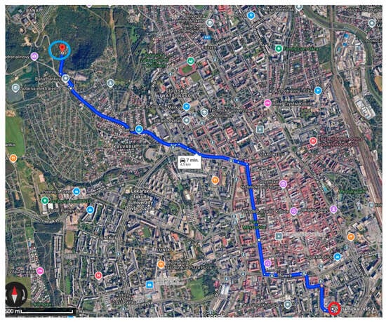 Illustration of the shortest possible route along paved roads from the Košice Požiarnická fire station (source: elaborated by authors).