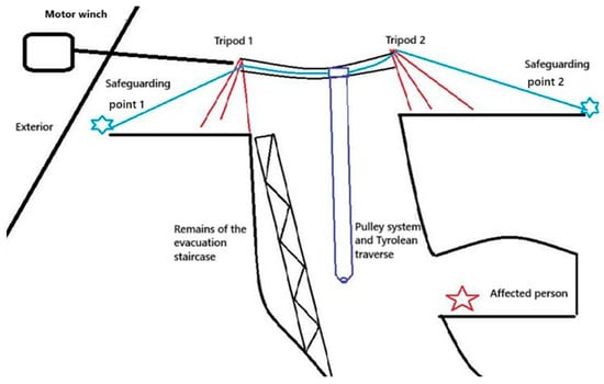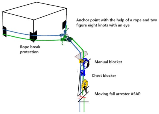 - The climbers are prepared, and anchoring points and a cableway are created, as shown in Figure 8. Subsequently, a means to arrest falling is connected to the safety rope and to the working rope connection, which allows for subsequent control of functionality.