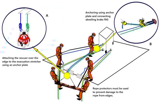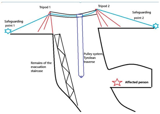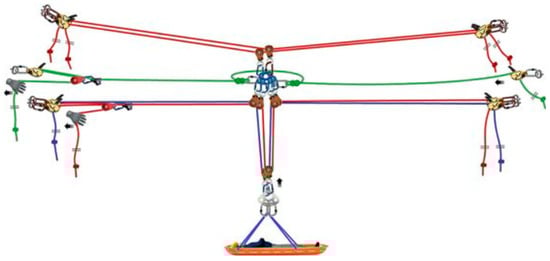 This method is based on the creation of a simple ropeway leading over the edge using a double rope technique. After creating an anchor point and preparing a reconnaissance group of climbers, reconnaissance and rapid assessment of the situation are carried out, and the basic actions required to stabilize the person’s health and determine the possibility of rescue based on the available number of rescuers, resources, and time urgency, calculated according to the person’s health, are performed (Figure 8) [45,46,47,48].