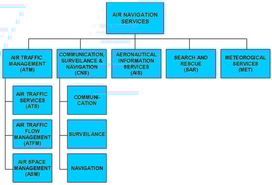 ANS is the term applied to the bundle of services provided to aircraft to enable safe and efficient flights from one destination to another. According to the ICAO (Doc 9734) [16] and Eurocontrol (ATM Lexicon) [17], Air Navigation Services (ANSs) are “services provided to air traffic during all phases of operations including air traffic management, communication, navigation and surveillance, meteorological services for air navigation, search and rescue and aeronautical information services”. ANS comprises ground-based radio navigation aids and precision approach and landing systems. The implementation of Global Navigation Satellite Systems (GNSS) will add satellite constellations, providing the standard signal positioning service and the associated augmentation systems required, i.e., satellite-based (wide area) and ground-based (local area) augmentations [16,17].