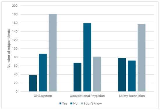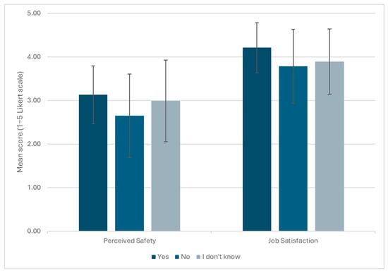 Figure 3 illustrates the relationship between participants’ perceptions of workplace safety and their overall job satisfaction, categorized by the reported presence of a health and safety (H&S) system in their organizational unit. Participants who confirmed the existence of an H&S system reported the highest mean levels of both perceived safety and job satisfaction. In contrast, those who indicated the absence of such a system reported statistically significantly lower scores on both dimensions. Interestingly, participants who were unsure about the presence of an H&S system tended to report intermediate levels of safety perception and satisfaction. The comparison between participants who reported the presence of an OHS system and those who did not showed a significant difference in job satisfaction (p = 0.0056) and perceived safety (p = 0.0058), both below the standard significance threshold of p < 0.05. The error bars in the chart represent the standard deviations, indicating some variability within each group. These findings suggest that awareness and clarity regarding the presence of structured health and safety protocols may play an important role in shaping both perceived security and satisfaction in the workplace.