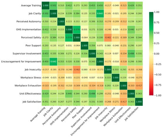 Workplace stress was also negatively correlated with perceived safety (r = −0.22), suggesting that greater stress levels are associated with lower safety perceptions and reduced satisfaction. No meaningful correlation was observed between stress and the perception of implemented health and safety measures (r = 0.015), implying that stress may not be directly influenced by formal compliance but more by personal or contextual workplace factors. Supervisor encouragement in decision-making correlated negatively with exhaustion (r = −0.33) and positively with job satisfaction (r = 0.33). Additionally, supervisor encouragement and colleague support were also found to be positively correlated (r = 0.036).