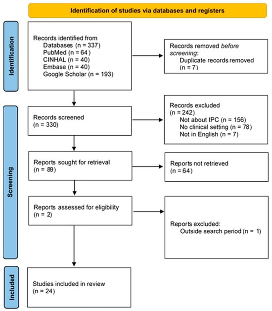 The initial search resulted in 337 articles (see Figure 1). Following the initial search, duplicate records (n = 7) were removed. Studies were excluded for the following reasons: not addressing interprofessional communication (n = 156), not focused on clinical settings (n = 78), not in English (n = 7), lack of full text (n = 64), and publication outside the inclusion timeframe (n = 1). As a result, 24 articles that met the inclusion criteria were retained and are included in the concept analysis. Additionally, we introduced a basic quality appraisal step, assessing included studies for clarity of objectives, methodological rigor, and relevance to IPC.
