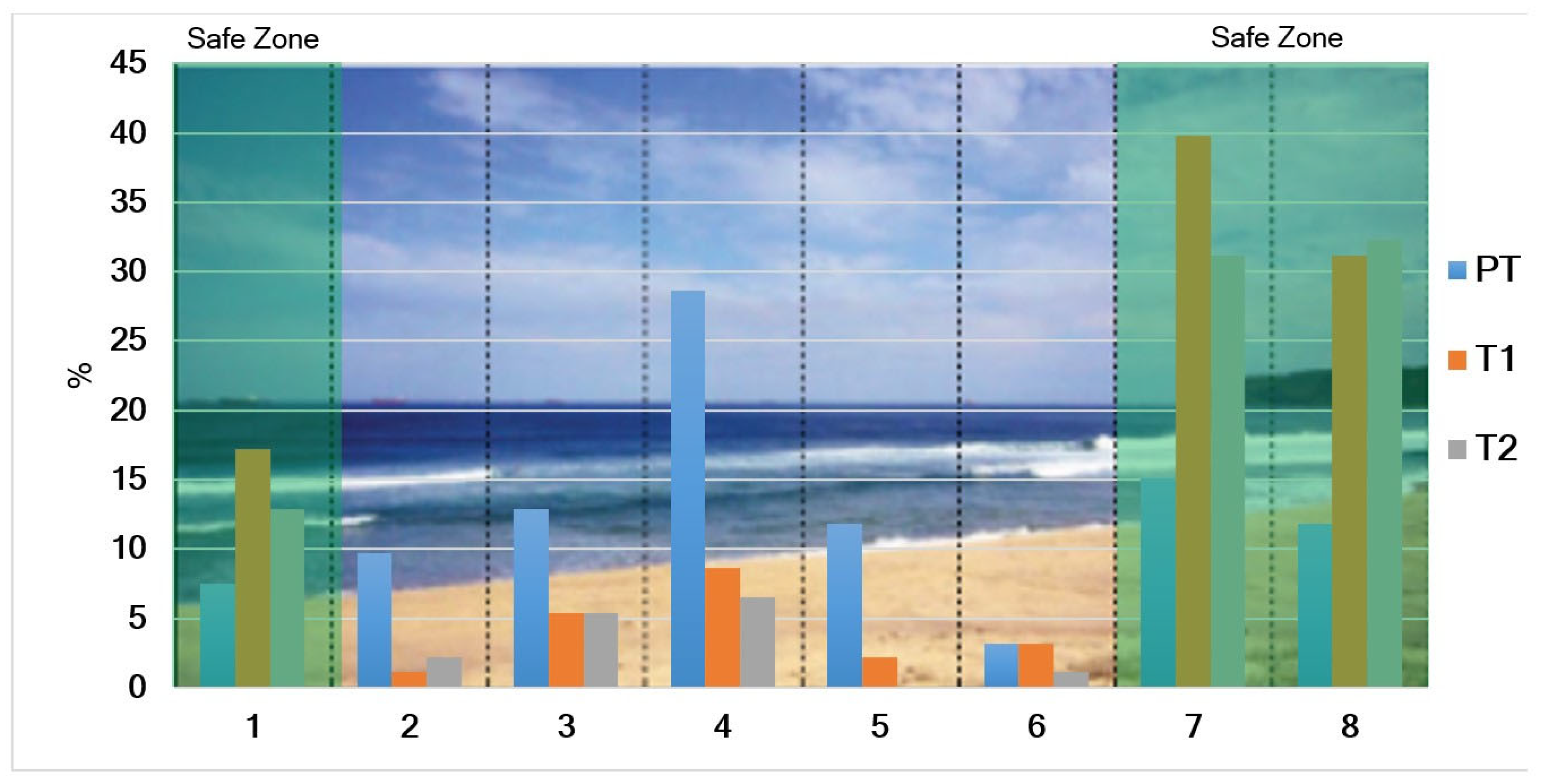 Prior to the training program, only 34.4% of participants were able to accurately identify any of the three designated safe zones (zones 1, 7, or 8). Following the intervention, this proportion increased markedly, reaching 84.9% at T1 and 79.6% at T2 (see Figure 1). The most significant improvement was observed in the selection of zone 7, indicating an enhanced ability to recognize the pattern of breaking waves as a key indicator of swimming safety subsequent to the training.