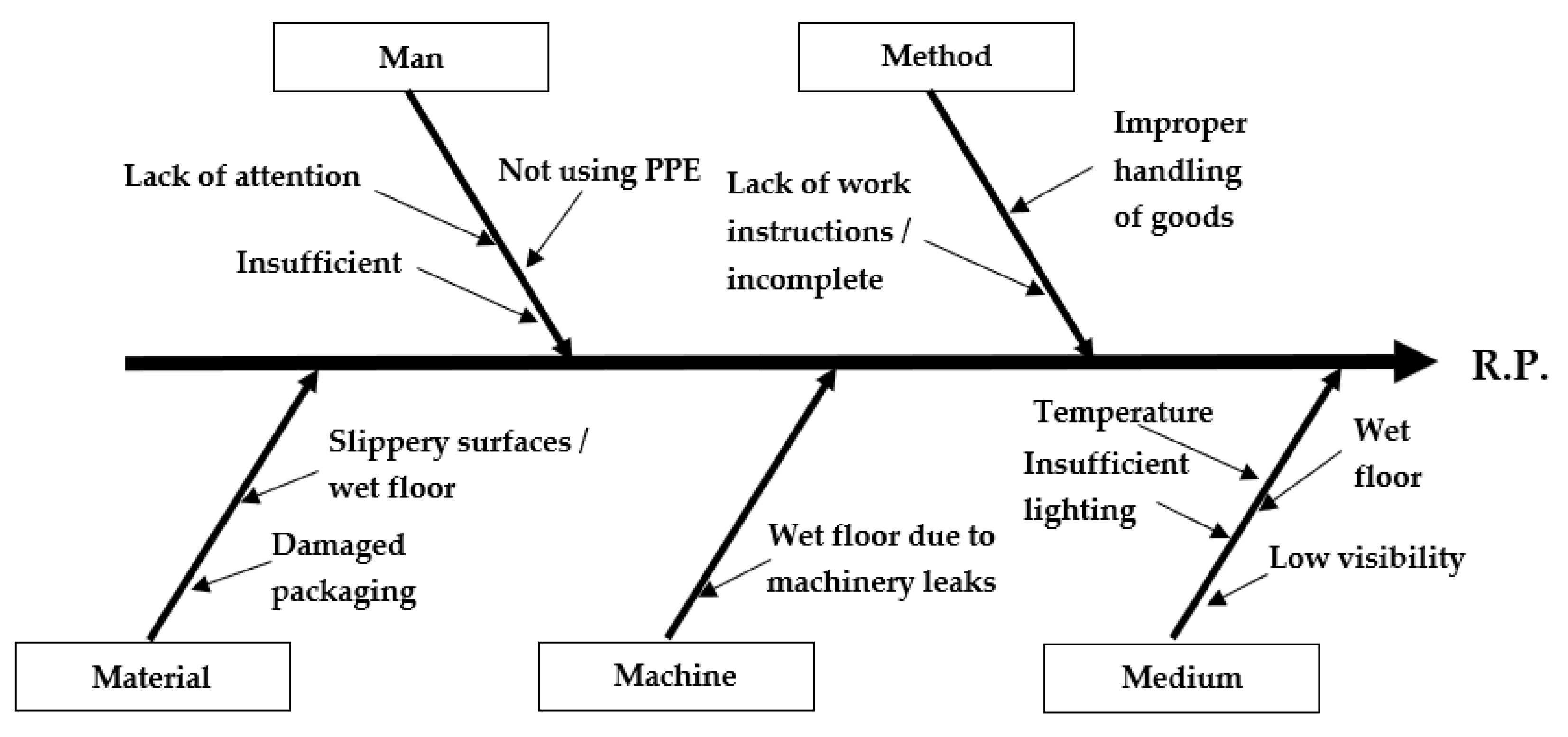 This structure shows how each 5M category contributes to hazard identification, the assessment of potential consequences, and the determination of preventive measures, exactly as the Ishikawa diagram is applied in OHS.