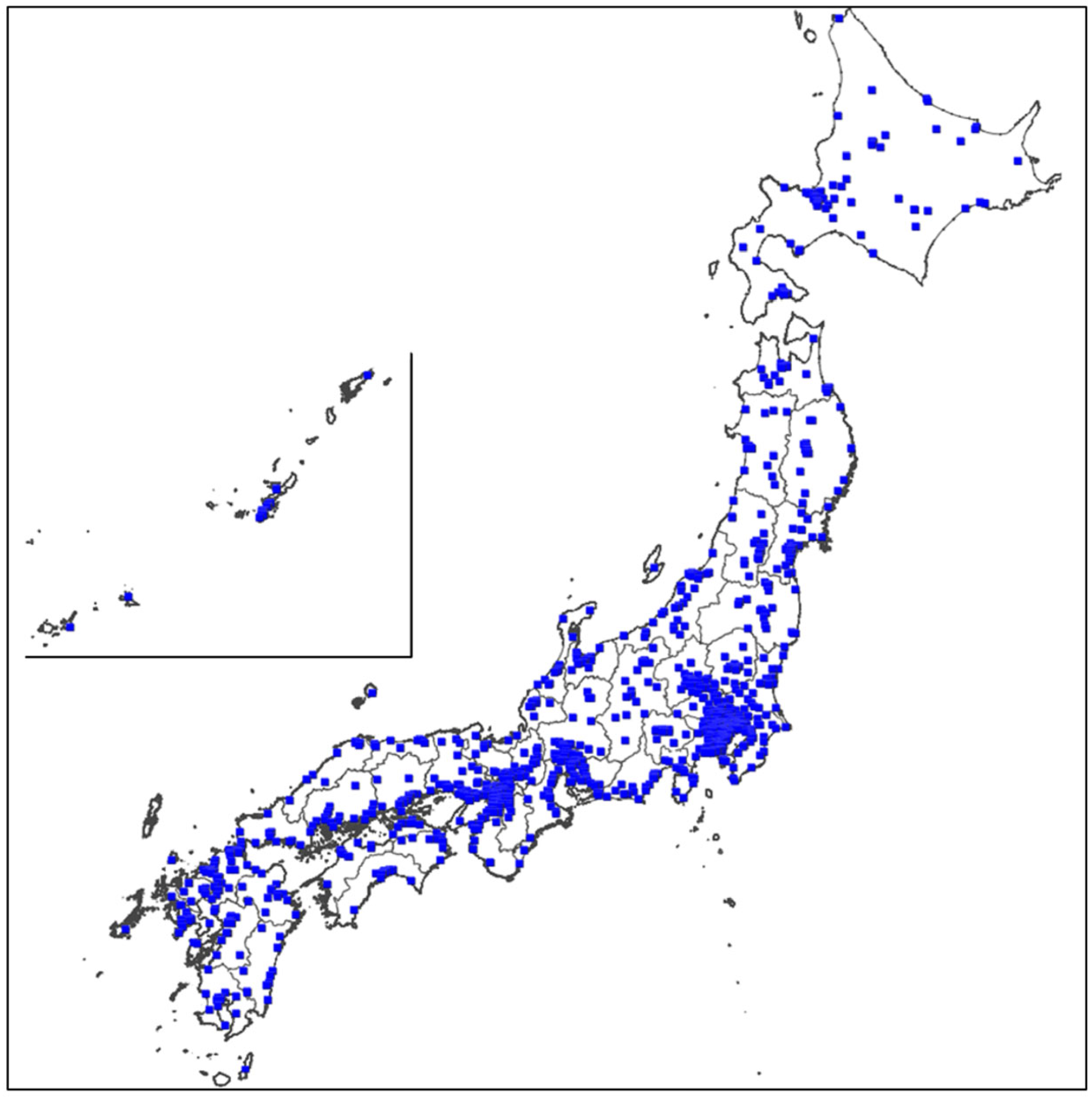 Figure 1. Special needs schools in Japan. Special needs schools from the 2020 list published by the Ministry of Education, Culture, Sports, Science and Technology (MEXT), which served as the basis for selecting the survey targets, are shown as blue dots [15]. A blank map provided by the Geospatial Information Authority of Japan, GSI Tiles, was used as the background, and the locations of the special needs schools were plotted [16].