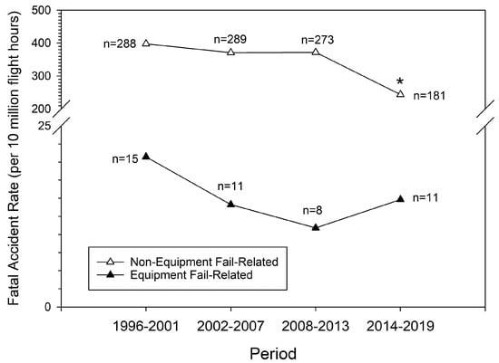 Equipment-related/unrelated fatal GA accident rates for experimental-amateur-built aircraft (1996–2019). This is based on Figure 1 but restricting the analysis to experimental-amateur-built aircraft. The shorter time frame reflects a later availability of fleet time for this group of aircraft required to calculate accident rates. A Poisson distribution was employed to determine if the rate change was statistically significant using the earliest period (1996–2001) as reference. *, p < 0.001. n, Fatal accident count.