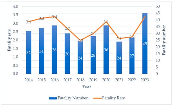 Worker fatalities: number of fatalities and fatality rate, 2014 to 2023 in Australia Construction Industry [2].