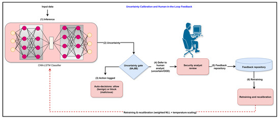 Human expertise is vital to triaging alerts. Kim et al. framed alert selection as an active learning problem, reducing the mean time to detection by up to 79%, while sustaining low false positives [30]. Nevertheless, most IDS pipelines operate automatically and neglect the quantification of the uncertainty. Temperature scaling, a standard calibration method in natural language processing (NLP) and computer vision (CV), has been shown to reduce overconfidence in bi-LSTM [32]; however, it remains underexplored in IDS research. Our framework explicitly combined temperature scaling, entropy-based abstention, and analytical feedback.