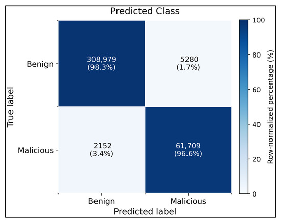 For binary intrusion detection (benign vs. malicious), the pipeline computes the ROC and PR curves, and selects a probability threshold based on the target false-positive rate. The bundled metrics_summary.json summarizes the performance of the CNN-LSTM model trained on all 46 features. At the chosen threshold (≈0.195), the test split achieved accuracy = 98.3%, recall = 96.6%, precision = 92.14%, false-positive rate = 1.7% and F1-score = 94.30%. Macro-and weighted averages for precision, recall and F1-score are all above 0.96, demonstrating that the model distinguishes benign from malicious flows with high fidelity. The accompanying classification report confirmed that the benign recall was 98.32% and malicious recall was 96.63%, with similar precision values. The ROC-AUC was above 0.97, and the PR-AUC exceeded 0.94, which is consistent with recent deep-learning IDS studies. A concise confusion matrix can be derived from these statistics: of the 308,979 benign flows in the test split, approximately 98.3% were correctly classified and only ~5,3% were false positives, whereas approximately 61,709 of the 63,861 malicious flows were true positives (Figure 6).