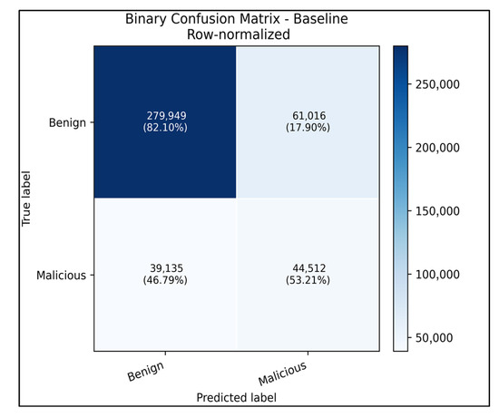 Row-normalized confusion matrix of the baseline binary CNN–LSTM evaluated on the CIC-IDS2017 dataset. Benign flows were correctly classified 82.1% of the time (17.9% false positives), whereas malicious flows reached 53.2% true positives with 46.8% missed detections, illustrating the remaining imbalance between benign and attack coverage even after calibration.