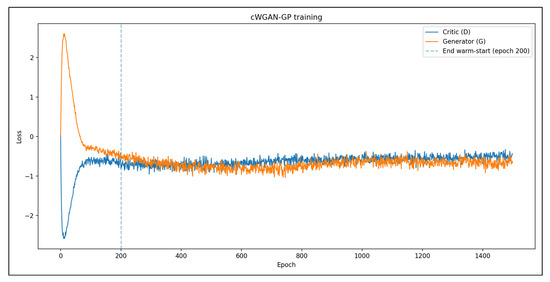 Training dynamics of the cWGAN-GP used for synthetic attack flow generation. The critic loss (blue) initially increased as the discriminator learned to distinguish between real and synthetic flows, and then stabilized with oscillatory behavior indicative of equilibrium. The generator loss (orange) gradually improved, reflecting the increased fidelity of the generated samples. The stable convergence pattern, with no mode collapse or divergence, validates the suitability of the cWGAN-GP for realistic network traffic synthesis in scenarios with imbalanced intrusion detection.