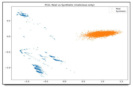 Convergence was confirmed by analyzing the generator–critic loss curve (Figure 8). To assess the generative fidelity of synthetic traffic flows, we utilized FID, MMD, and JSD, calculated over a shared 46-dimensional feature space between real and generated samples. These metrics function as measures of distributional similarity (Table 7). Principal component analysis (PCA) overlays (Figure 9) further validated that the synthetic procedure ensured that ultra-rare classes received adequate synthetic support, while maintaining proportionality across frequent classes. VAE seeding prevented mode collapse for underrepresented categories and cWGAN-GP preserved the fidelity of the feature distributions. This strategy enhances classifier exposure without compromising diversity.