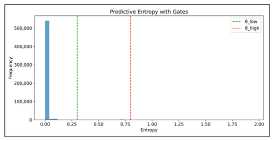 Two entropy thresholds were defined: predictions with entropy below were automatically accepted and those above were deferred to a human analyst for review. The intermediate cases were automatically processed. Analyst feedback on flagged flows is stored in a repository and periodically used to retrain the classifier, ensuring that the model adapts to novel threats without overburdening the analysts. The overall uncertainty-guided human-in-the-loop feedback is shown in Figure 5.