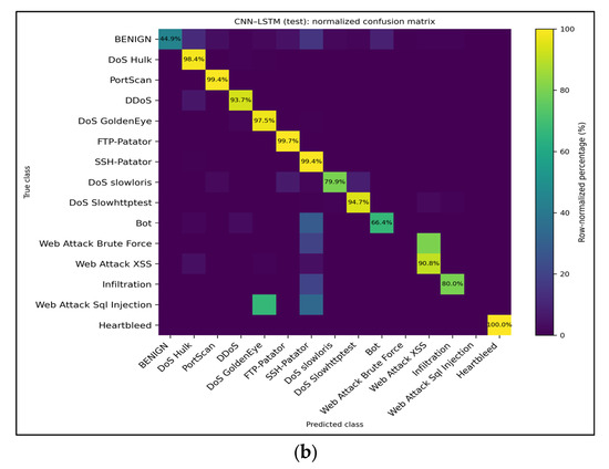 Recent studies have explored various DL approaches for overcoming these challenges. Hybrid models combining convolutional neural networks (CNNs) and long short-term memory (LSTM) networks are promising for capturing spatial and temporal features of network flows [19,20,21]. Abdallah et al. [22] built a hybrid CNN-LSTM-based intrusion detection system with regularization strategies to enhance the detection of zero-day attacks, attaining an accuracy of 96.32% on the InSDN dataset. Sinha et al. [23] suggested a hybrid 1D-CNN–LSTM architecture (with self-attention) for IoT traffic that uses a CNN to extract spatial features and LSTM to extract temporal features. Wang et al. [24] evaluated deep neural network (DNN) models, RNNs, LSTMs, and CNNs. Their results indicated that simpler architectures such as CNNs and RNNs achieved over 98% accuracy. These are also suitable for real-time IDS applications. This indicates a speed–accuracy trade-off in the detection. However, these successes often rely on balanced training data and are not transferred across the datasets [10]. Furthermore, DL models tend to produce overconfident probabilities, which can mislead human operators and hamper effective decision making.