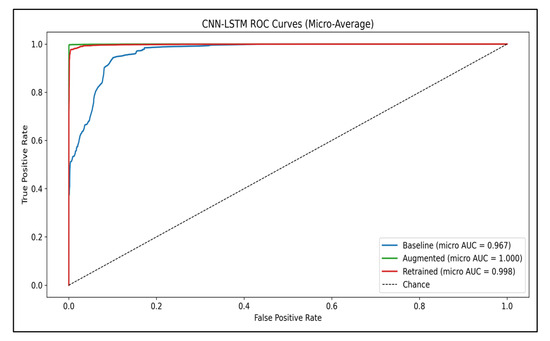 We trained the hybrid CNN–LSTM baseline on the curated 46-feature spine produced by our leakage-safe preprocessing pipeline. The classifier stacks two causal convolutional blocks (64–112 filters) with temporal pooling, followed by an LSTM head (128–224 units) and softmax output over all the 15 CIC-IDS2017 classes. Training uses Adam with learning rates in the range 5 × 10−4–1 × 10−3, class-balanced focal loss when enabled, and pre-class weights derived from the training split to counter severe imbalance. Each stage, baseline, augmented, and retrained, ran for 10–20 epochs with an early stopping surrogate (the best-performing checkpoint for validation accuracy). The GAN-driven augmentation and retraining stages reuse the same backbone to ensure comparability, while allowing the data distribution to change (synthetic minority inflations, feedback merges, and adversarial/noise conditioning).