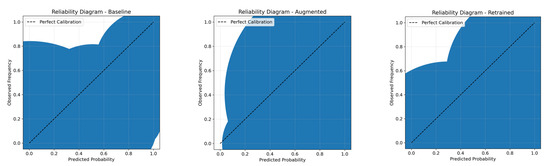 Reliability diagrams for the CNN–LSTM binary classifier at each pipeline stage. The baseline (left) remains close to the diagonal (ECE ≈ 0.04, Brier ≈ 0.11); augmentation (middle) is strongly overconfident, with bins diverging from the diagonal (ECE ≈ 0.62, Brier ≈ 0.51); and retraining (right) partially realigns the probabilities (ECE ≈ 0.32, Brier ≈ 0.28).