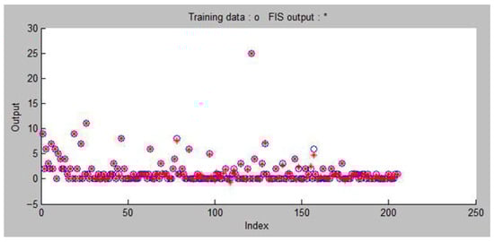 A plot of training data output against trained FIS output.