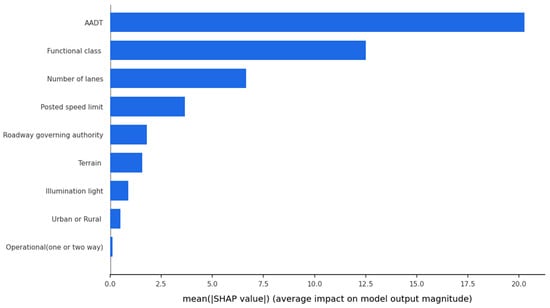 As illustrated in Equations (5)–(9), the XGBoost regression model was executed as an ensemble of 300 trees (maximum depth = 6) trained using a learning rate of 0.05. Model optimization was conducted using 5-fold cross-validation to minimize mean-squared error. The tuned model had a squared R of 0.857, indicating that 85.7 % of the pedestrian crash frequency variability was explained by the independent variables such as AADT, number of lanes, etc. The model detected nonlinear relationships among traffic exposure (AADT), roadway geometry, and operation variables without overfitting through subsampling and feature-column sampling. Figure 4 illustrates the contribution of all variables in pedestrian crashes, and its key features seem to be more contributors in pedestrian crash frequency. Figure 5 presents the SHAP (SHapley Additive exPlanations) summary results for the XGBoost pedestrian crash frequency model, illustrating the relative importance of each variable in predicting the number of pedestrian crashes. SHAP values quantify each feature’s average contribution to the model’s output, meaning variables with higher mean SHAP values have a greater overall impact on predicted crash frequency.