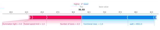 The analysis through SHAP force demonstrated how different roadway features influenced the model’s predicted pedestrian crash frequency for a specific roadway segment (Figure 5). The model predicted crashes higher than the overall average prediction. The red and blue bars represent the direction and magnitude of each feature’s effect on the prediction in which the red shows the prediction is higher while the blue shows the prediction is lower. Features shown in red increased the predicted crash frequency, while those in blue decreased it. In this case, the absence of lighting, higher posted speed limit, and a greater number of lanes contributed positively to crash occurrence by increasing pedestrian crashes and risk.
