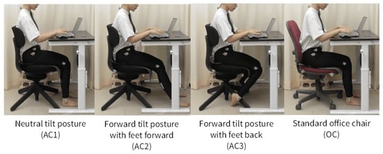 To evaluate the effects of the seat-tilting feature of the 360° swaying chair, the participants performed a 5 min VDT task under four conditions (Figure 5). These included three postures in the 360° swaying chair—a neutral tilt posture (AC1), forward tilt posture with feet forward (AC2), and forward tilt posture with feet back (AC3)—and one control condition involving a typical posture in a standard office chair (OC).