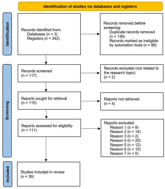 Out of a total of 342 documents initially retrieved, 139 were duplicates, resulting in 203 unique articles. Among these, 86 were classified as document types other than scientific articles (e.g., meeting abstracts, awarded grants, theses, books, conference papers), and 2 were not related to the research topic, as they addressed neither autism nor occupational risk. Additionally, 4 records could not be retrieved in full text.