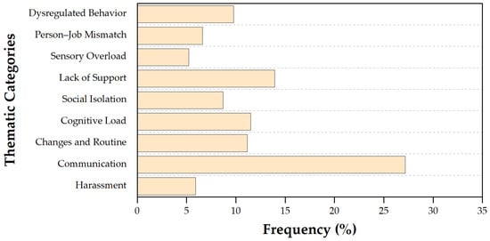 The risk factors identified in the studies were classified into nine thematic categories, ensuring that all cases could be included within one or more of these categories. In total, 215 risk situations were identified: (1) harassment, including aggression, and discrimination; (2) communication, encompassing difficulties in expressing oneself and understanding others; (3) changes or routine, related to disruptions in routines and lack of predictability; (4) cognitive load, involving excessive mental demands; (5) social isolation, referring to exclusion and lack of social connections; (6) lack of support, where the environment fails to provide necessary resources; (7) sensory overload, including noisy and visually overstimulating environments; (8) person–job mismatch, where tasks are not aligned with the individual’s profile; and (9) dysregulated behaviors, stemming from impulsive or aggressive actions.