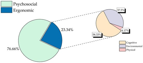 Figure 3 reveals a clear predominance of psychosocial risks, accounting for 76.66% of all 215 identified factors. Among the most frequent factors are a low sense of social belonging, limited social support from supervisors, lack of autism-related knowledge among coworkers, supervisors, and job coaches, and difficulties switching between tasks. On the other hand, although to a lesser extent, ergonomic factors were also reported, accounting for 23.34%. Among these, cognitive factors were the most represented, indicating that mental demands are among the main challenges, especially when linked to multiple tasks that are overly varied or difficult to complete without adequate support. It was also observed that physical and environmental ergonomic risks were the least addressed areas (sensory overload was not among the most discussed categories).