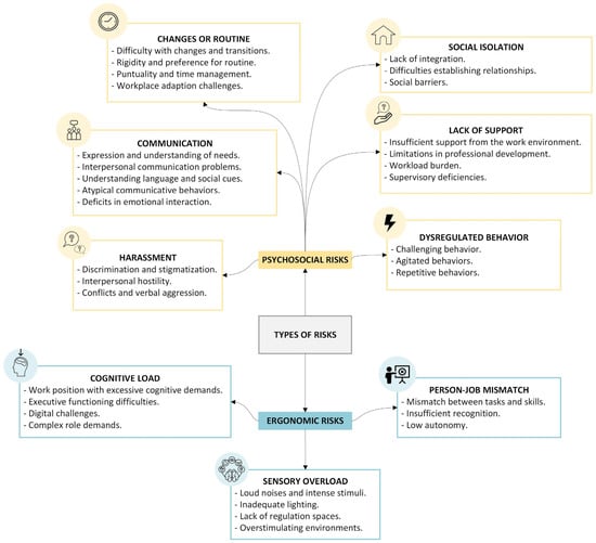 17], for their part, explored the employment experiences of young adults with developmental disabilities, including individuals with ASD, through interviews and focus groups with support professionals. The study identified several frequent psychosocial risk factors, such as sensory overload, difficulty transitioning between tasks, the need to multitask across different duties, and anxiety when asking for help. Support professionals also highlighted challenges related to difficulties in following workplace social norms and understanding interpersonal boundaries.