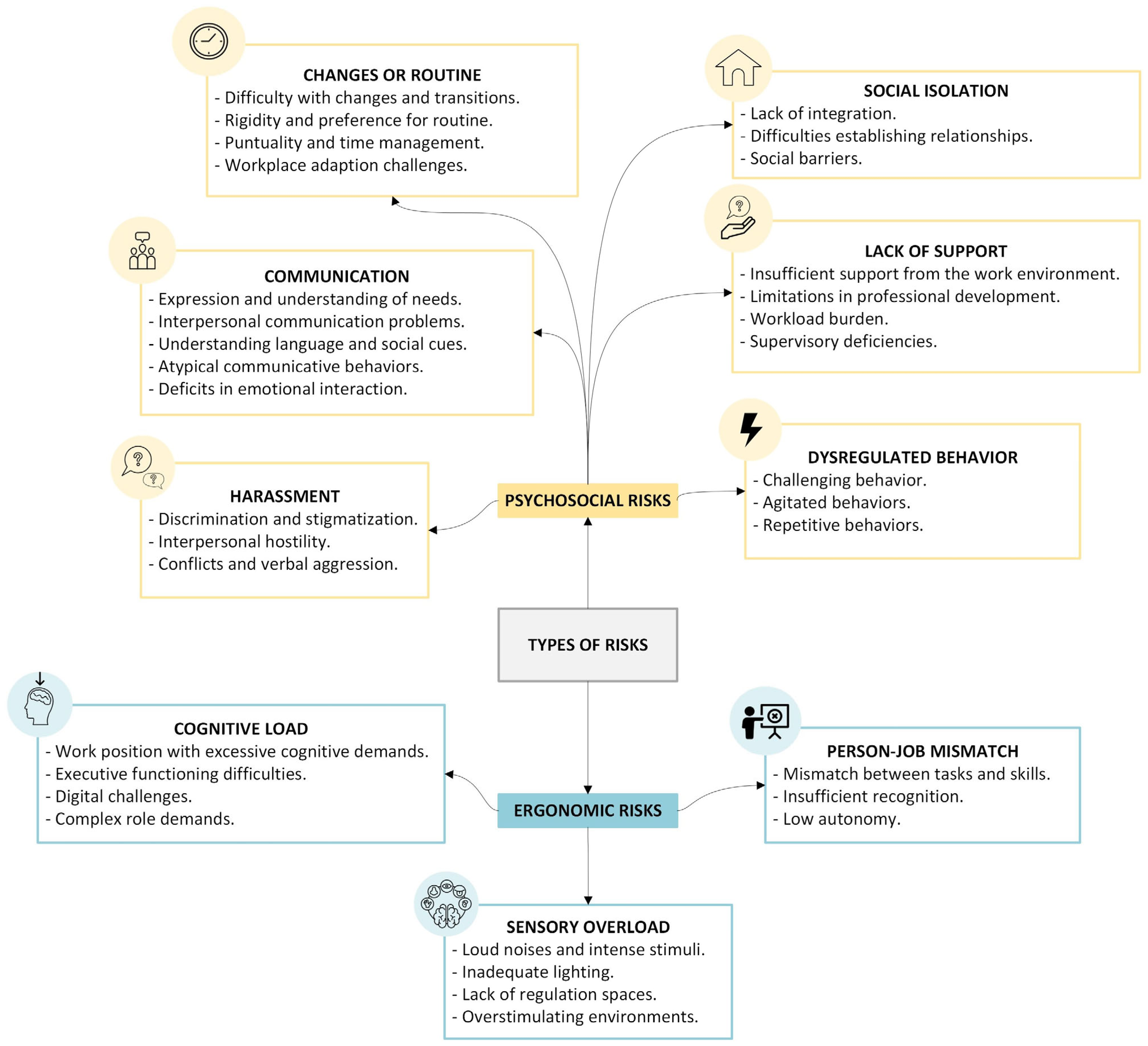 The analysis of the reviewed studies allows the identification of a series of occupational risk factors that recurrently affect autistic individuals in the workplace. Although the approaches and contexts of the studies vary, commonalities among authors can be identified. The classification of occupational risks is synthesized in