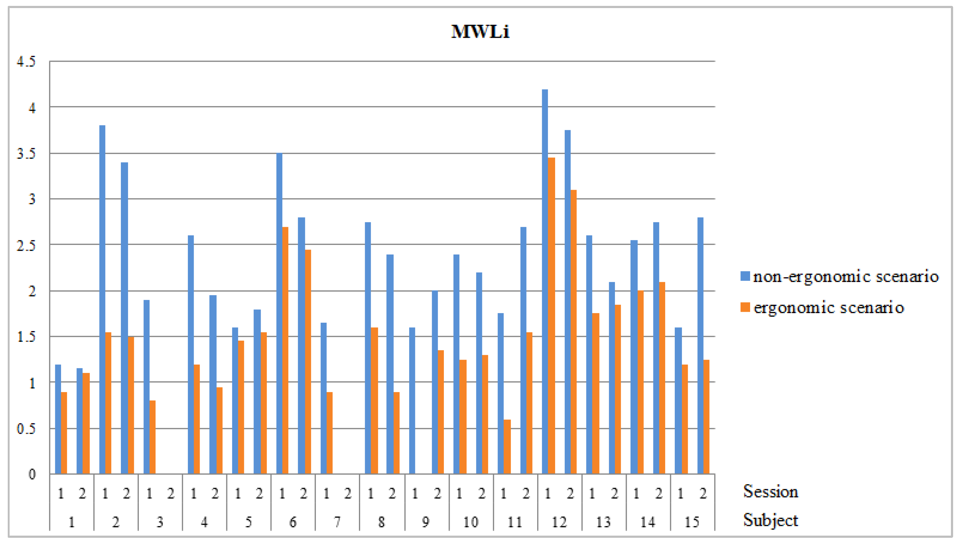 MWLi in the non-ergonomic scenario across both sessions is 2.41. In the ergonomic scenario,