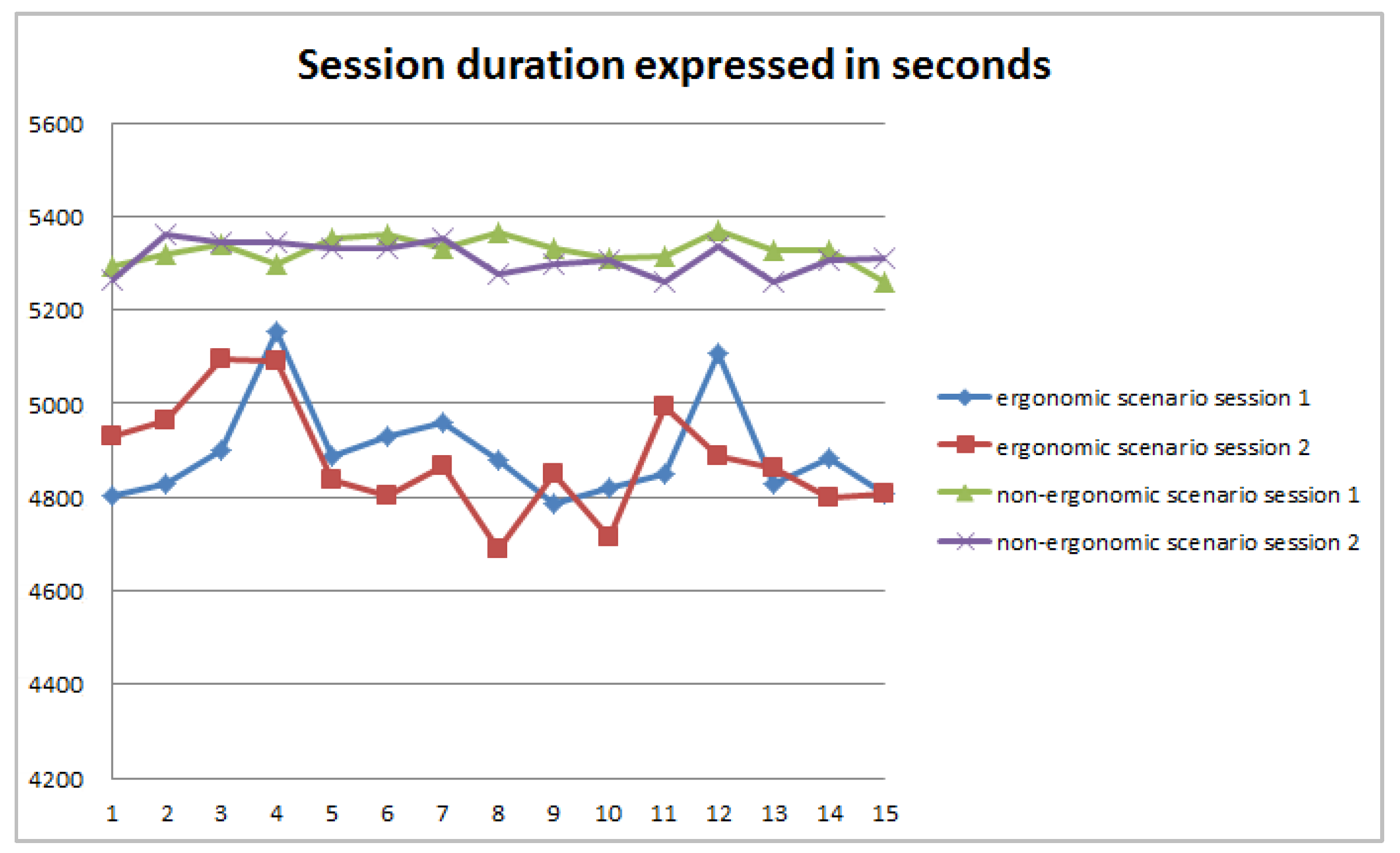 The figure also show that the duration of the activity is less in the ergonomic scenario compared to the non-ergonomic scenario for most participants, which indicates that all participants completed work tasks faster in the ergonomic scenario. If this data were expressed quantitatively, the average duration of both sessions in the non-ergonomic scenario was approximately 177 min, while in the ergonomic scenario it was about 162 min. This means that the session duration was reduced by approximately 8%.