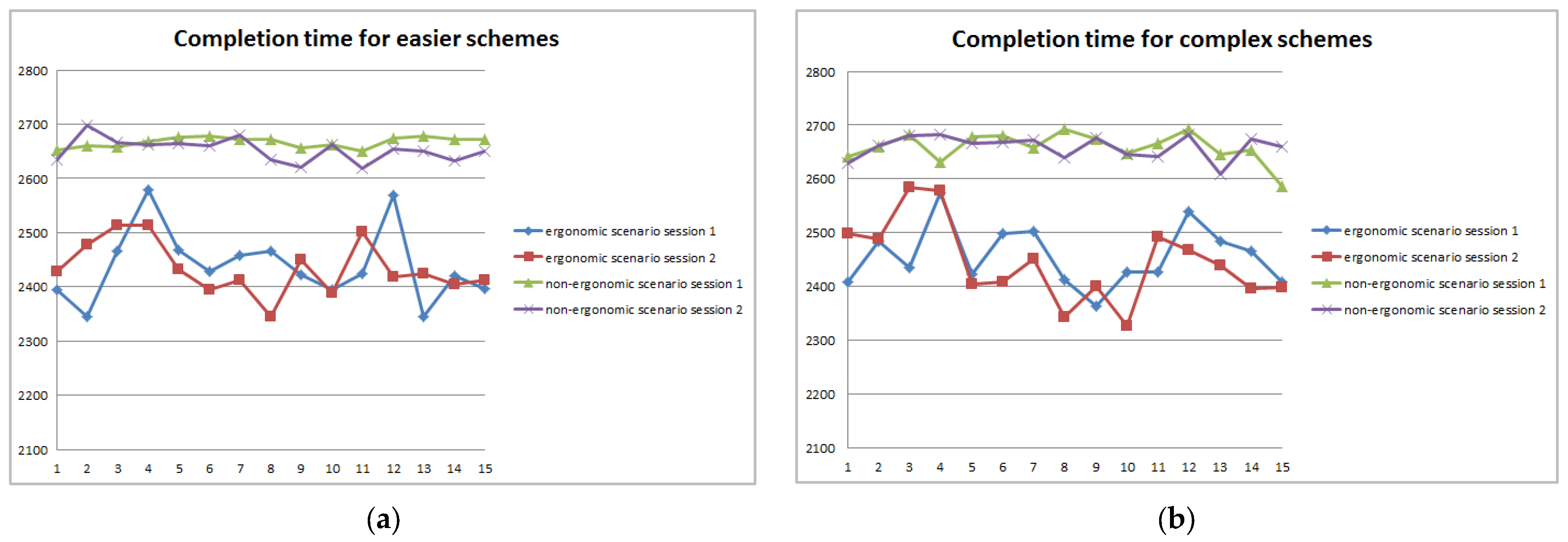 Figure 10, it can be seen that for some participants the duration of the first session was shorter than the second session in both scenarios. For some participants the opposite situation was observed. The results obtained showed that the effective application of ergonomic principles when designing work systems, establishing a balance between worker characteristics and work task requirements, and harmonizing the workspace, tools, and work methods with the physiological, psychological, and cognitive abilities of participants contribute to improving productivity.