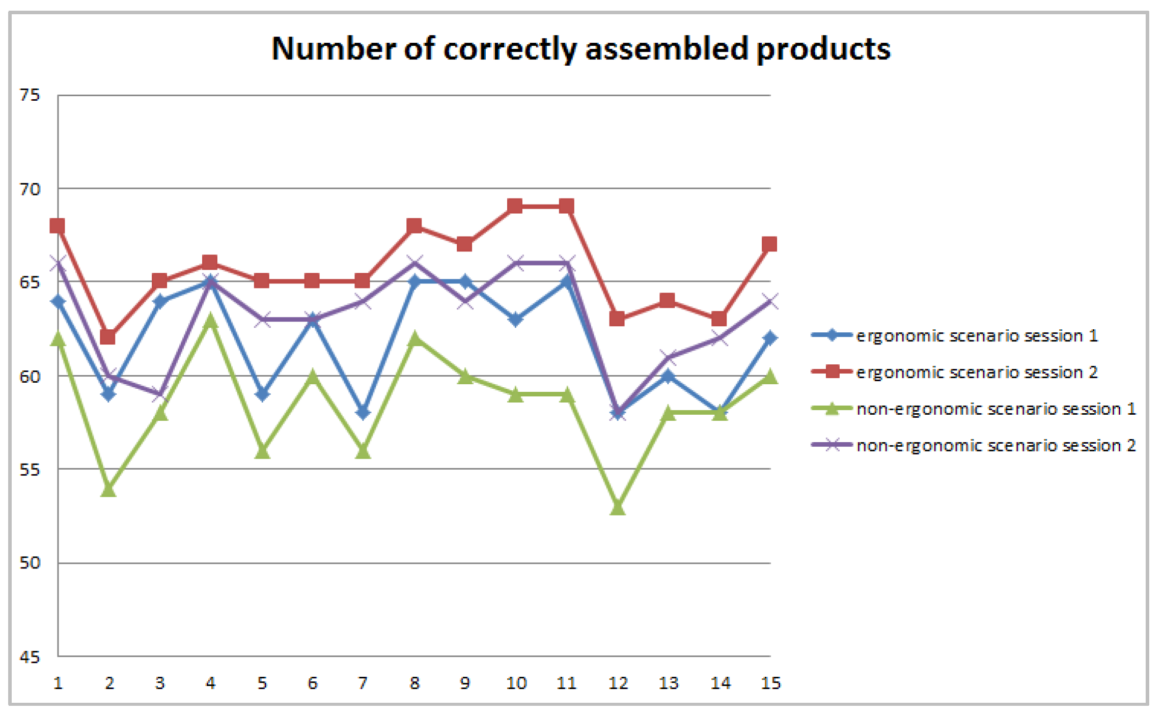 Figure 12 shows a comparative overview of correctly assembled products in the non-ergonomic and ergonomic scenarios. The number of correctly assembled products is significantly higher in the ergonomic scenario.