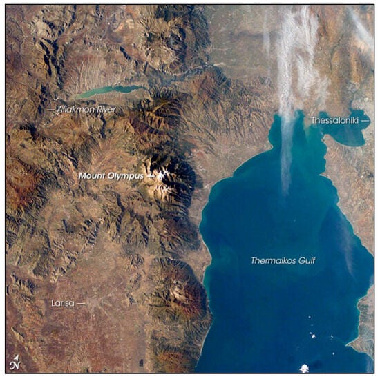 Figure 2. Map of Greece and spot of Olympus mountain (this file is licensed under the Creative Commons Attribution-Share Alike 3.0 Unported license. https://commons.wikimedia.org/wiki/File:Greece_relief_location_map.jpg (accessed on 18 January 2026)).