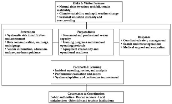These operational components are sustained by cross-sector governance involving park authorities, municipalities, rescue services, tourism actors, and local communities. Feedback loops—through incident analysis, monitoring data, and stakeholder evaluation—enable continuous adaptation and learning. Rather than a static model, the framework represents a flexible structure capable of evolving alongside environmental change and tourism dynamics.